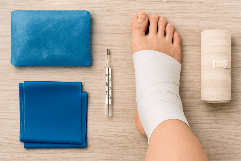 - Compression(圧迫):弾性包帯などで軽く圧を加えることで腫れを抑える効果があるとされています。