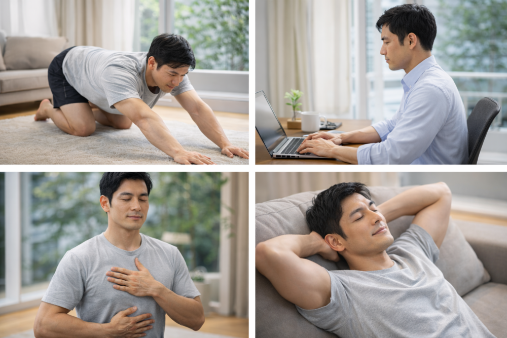 「背中をほぐせば改善する」と一概には言えず、どの筋肉が、なぜその状態になっているのかを検査で整理することが大切だと考えています。セルフケアでも、闇雲にストレッチを行うのではなく、呼吸や姿勢を意識した軽い動きから始める方法をおすすめしています。