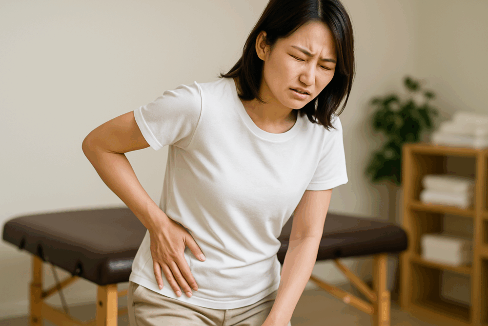 後ろ側の痛みは、お尻の筋肉(特に中殿筋・梨状筋)が硬くなっている場合や、腰からの神経の影響が出ているケースがあります。長時間座る習慣や反り腰姿勢が関係していることも考えられます。