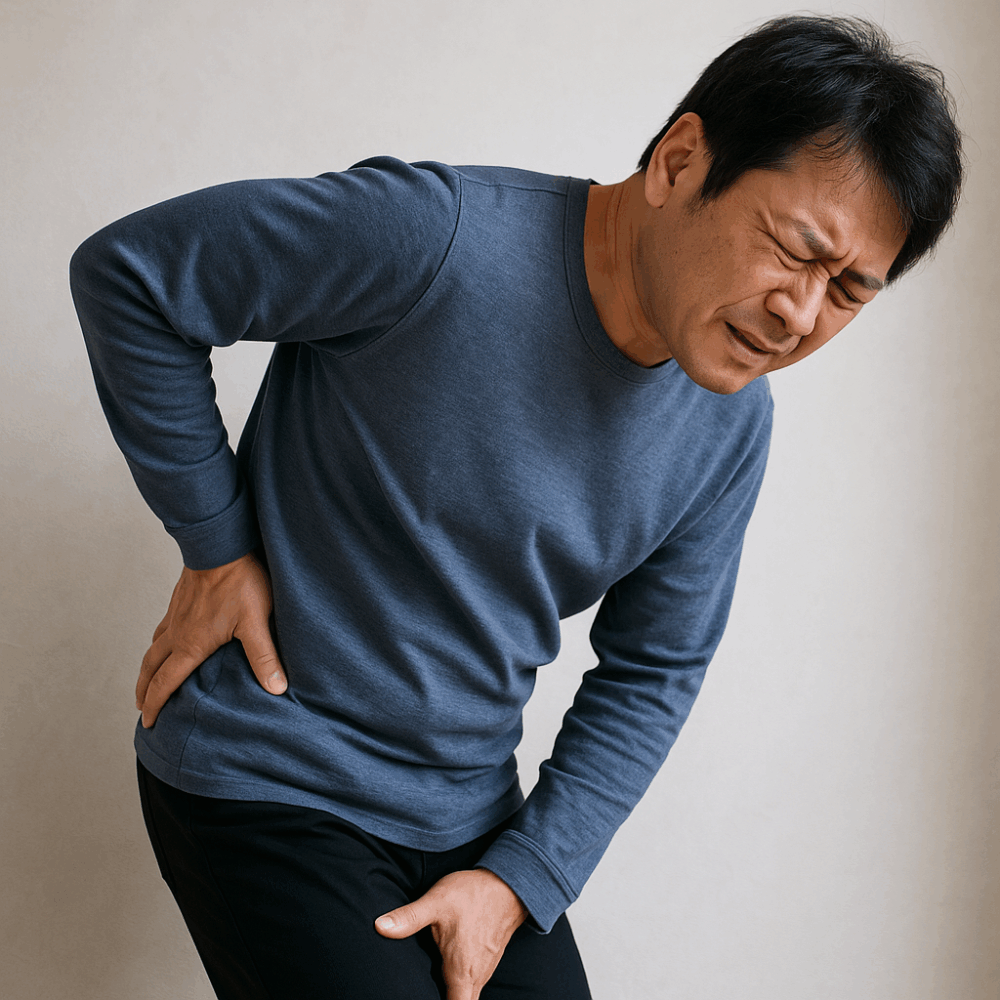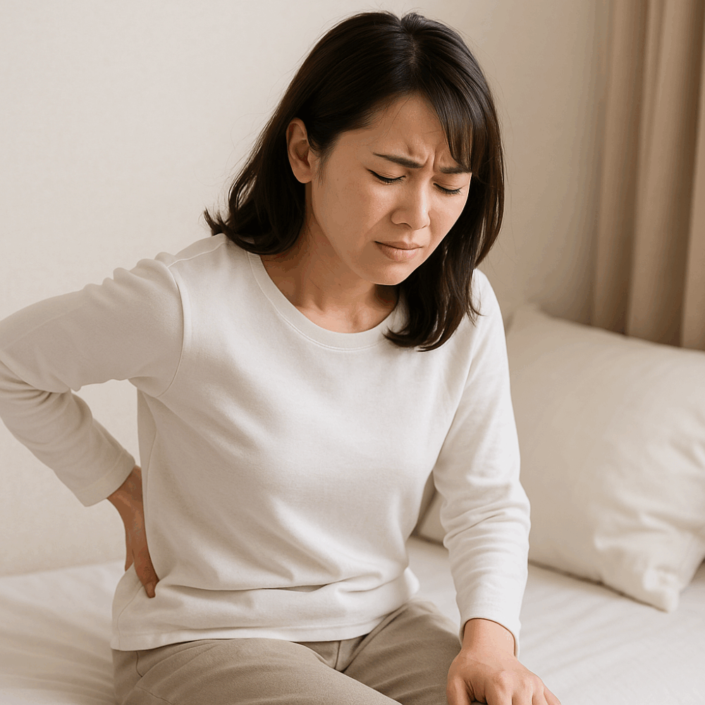 多くの人が感じるのは、片側のおしりや脚の痛み・しびれ・重だるさなど。座っていると悪化する、立ち上がるときにズキッとくる、長く歩くと脚がしびれてくる──といった形で現れるケースも少なくありません。
