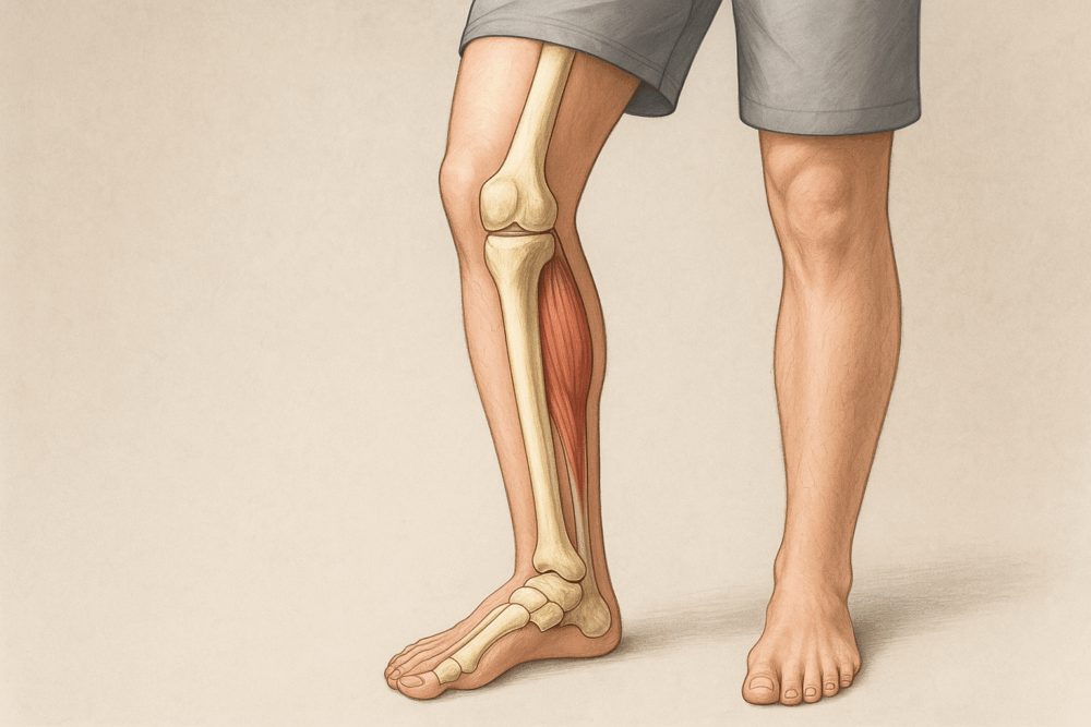 脛は一本の骨ではなく、**脛骨(内側)と腓骨(外側)**の2本の骨から構成されています。脛骨は体重を支える役割を持ち、腓骨はバランスや筋肉の付着に関わると言われています。これらを包むように「前脛骨筋(ぜんけいこつきん)」があり、足首を持ち上げる動作(背屈)や歩行の安定に大きく関わっています。