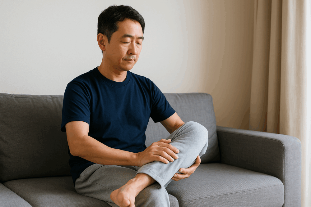 梨状筋症候群が疑われるときは、まず「お尻の奥の圧痛」と「脚のしびれ方」を確認することが大切です。椅子に座り、片足を反対側の膝に乗せて軽く前に倒すと、お尻の奥に張りや痛みを感じることがあります。また、仰向けで足を伸ばした状態から内・外にひねった際にお尻の奥が突っ張るような感覚がある場合も、梨状筋の緊張が関わっている可能性があるといわれています。こうしたセルフチェックは、痛みの出方や左右差を把握する目安になりますが、強い痛みが出る場合は無理せず中止することが大切です。