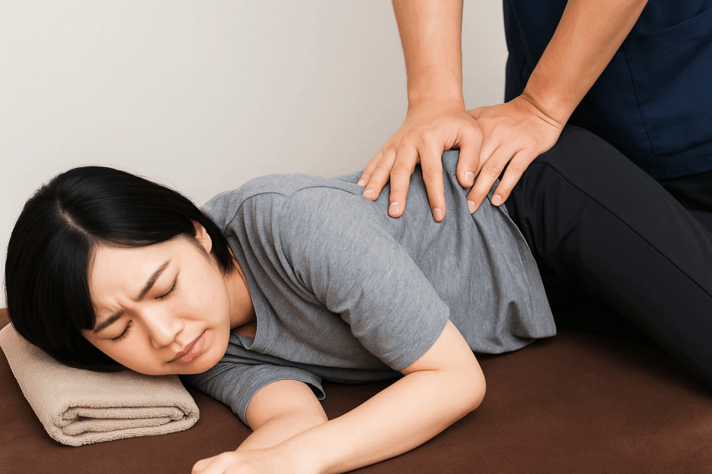 当院ではまず、骨盤の位置や股関節の動きを細かく確認します。立位・座位・仰向けでの検査を通して、梨状筋だけでなく、中殿筋や大腿方形筋などの関連する筋群の硬さや動きをチェック。さらに、左右の脚長差、骨盤の傾き、腰から下肢への神経の流れを丁寧に触診して、神経圧迫の有無や筋肉の緊張度を見極めていきます。この段階で「筋肉の張りによる痛み」なのか「神経の通り道の問題」なのかを分けて考えることが、的確なアプローチにつながります。