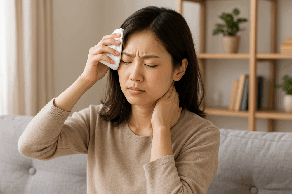 片頭痛のようにズキズキと脈打つような痛みがあるときは、血管が拡張しているサインのことが多く、冷やすことで血流を落ち着かせると楽になる場合があります。タオルで包んだ保冷剤をこめかみや首の後ろに当てて、数分間ゆっくり深呼吸をしてみましょう。
