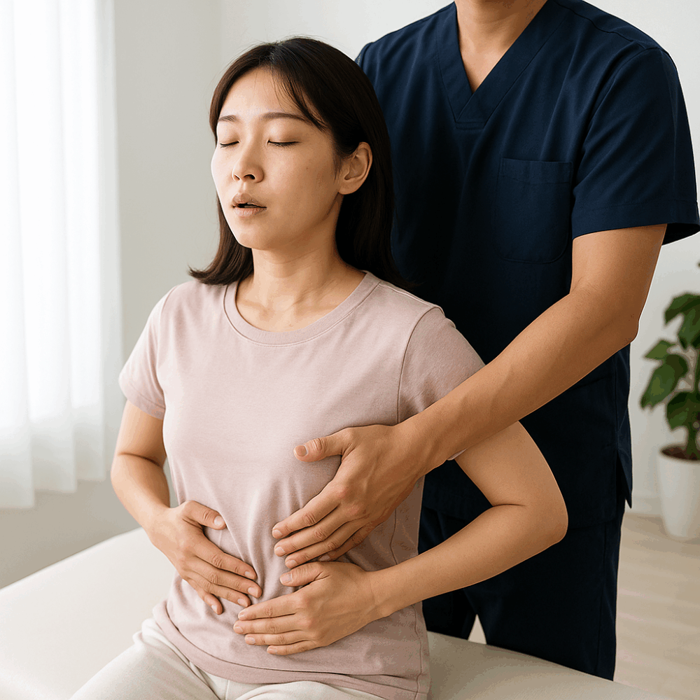 当院では、施術後にも呼吸に合わせて動く「肋骨のリズム」を整える練習を取り入れています。