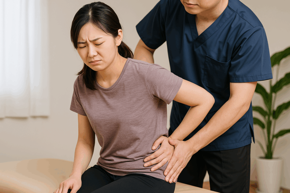 股関節そのものだけではなく、内科・婦人科領域の不調が関連して左側に違和感が出る場合もあります。ただし、当院では医療的な診断行為は行いませんので、強い痛み・発熱・下腹部の違和感などが続くときは、医療機関での検査が必要な可能性がありますとお伝えしています。
