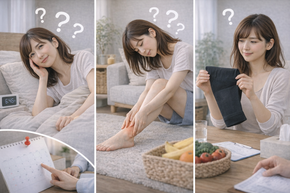 足のむくみは、男性よりも女性のほうが感じやすい傾向があります。その理由のひとつがホルモンバランスです。生理前や体調の変化がある時期は、水分をため込みやすくなることが知られています。