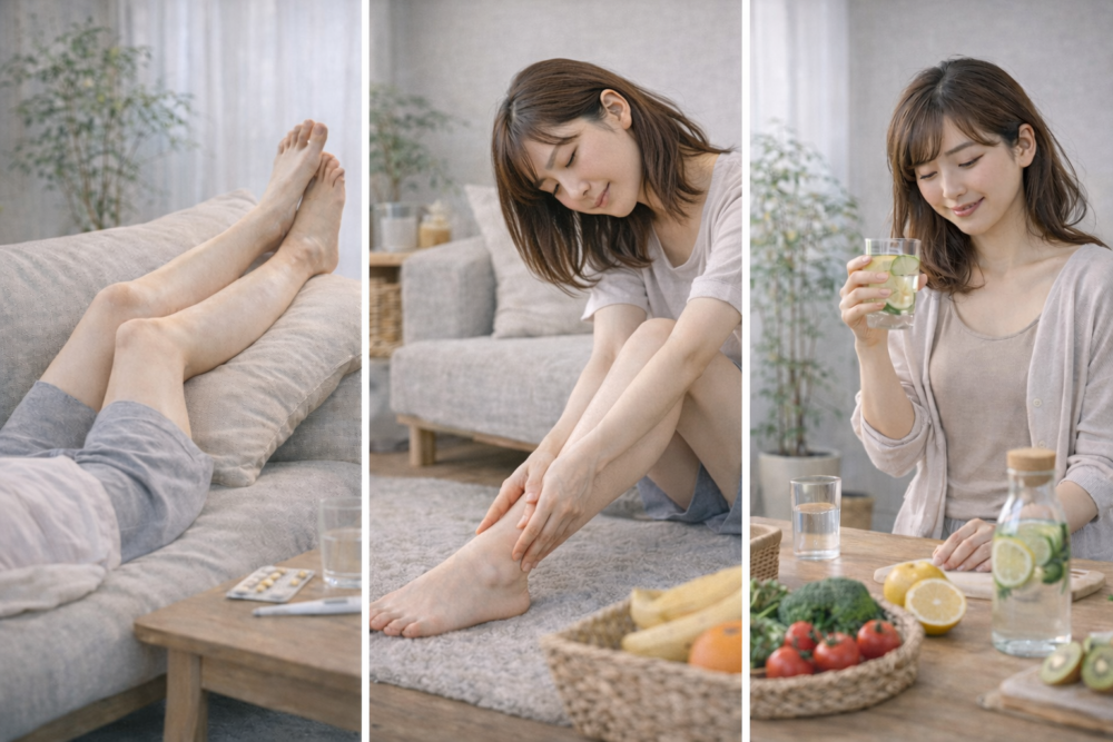 そんなとき、まず意識したいのが足を高くして休むことです。横になるときにクッションやタオルを使って足を心臓より少し高い位置にすると、重力の影響がやわらぎ、下半身にたまった水分が戻りやすくなります。ソファでだらっと過ごすより、ほんの数分でも高さをつけるだけで感覚が変わる方もいます。