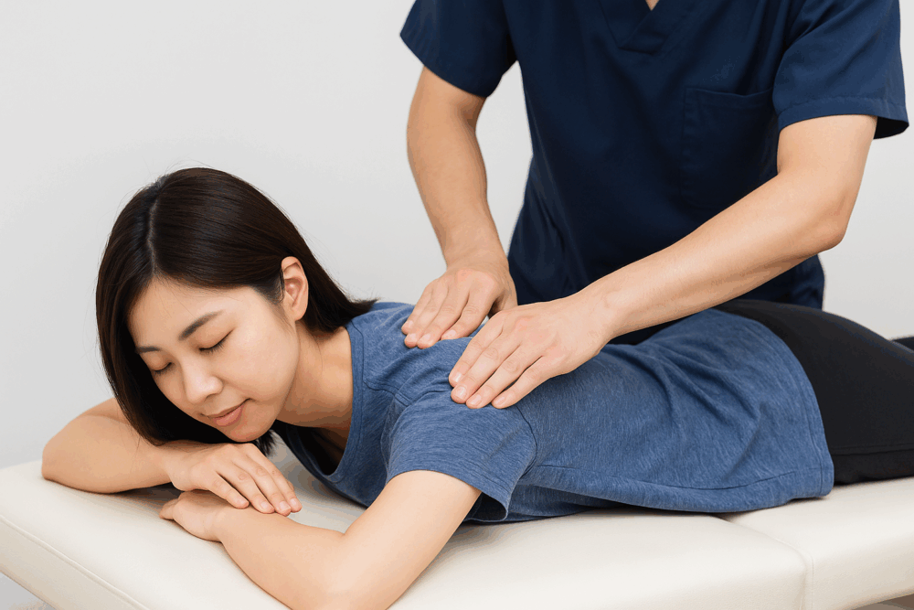 筋肉痛のある部位を無理のない範囲で軽く伸ばすストレッチや、優しいマッサージを行うと血流が改善し、疲労物質の排出が促されると言われています。痛みが強いときは無理に動かさず、温めながら軽くほぐす程度にするとよいです。当院でも、施術前後に安全な範囲で筋肉の柔軟性を確認しながらセルフケアを指導しています。