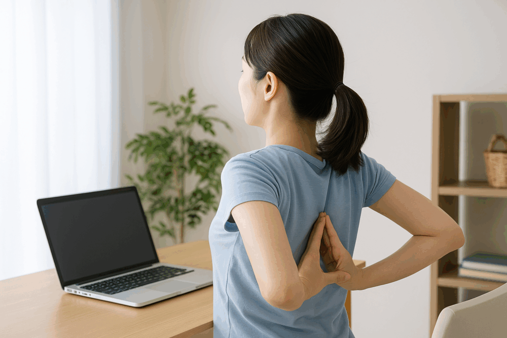 首の痛みの背景には、スマホやパソコンでの前傾姿勢が大きく関係していると言われています。顎が前に出ると首の筋肉は常に引っ張られ、慢性的な緊張状態に。椅子に深く腰をかけて背中をまっすぐに保つ、モニターを目線の高さに合わせるなど、小さな工夫が大きな変化につながります。
