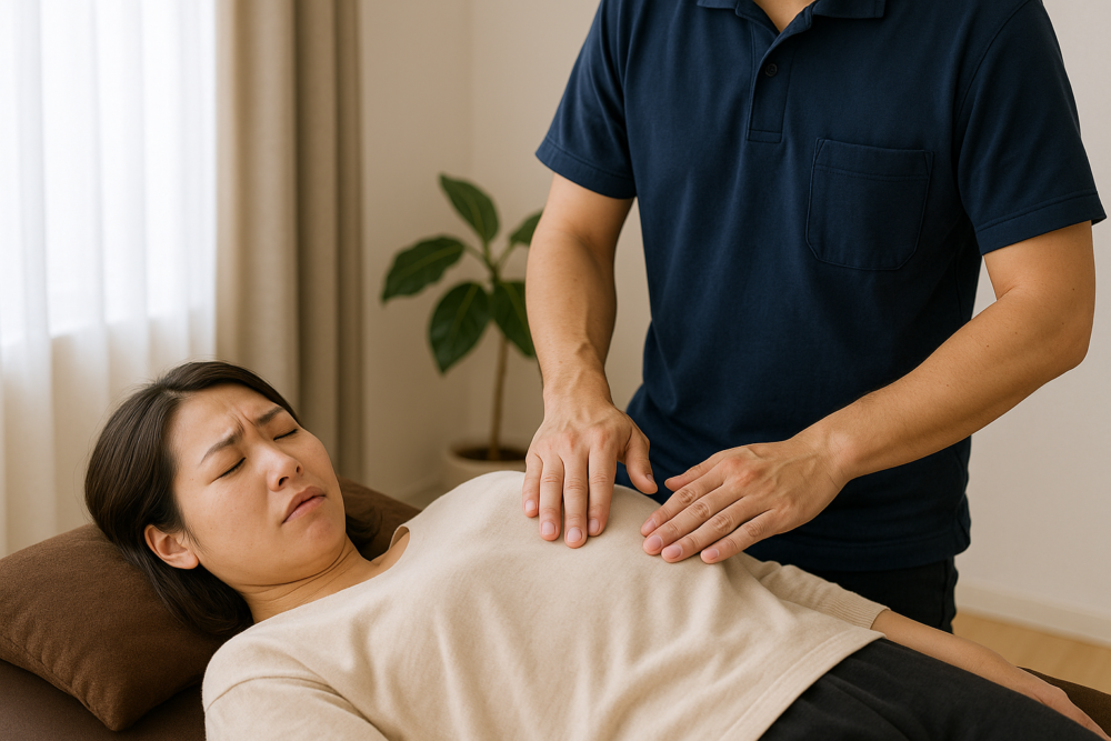 ただし、こうした内臓の問題は整体で断定することはできません。当院では、触診や動作検査で筋骨格の要因がどれくらい関わっているのかを見極め、必要に応じて医療機関での相談をおすすめする流れをとっています。
