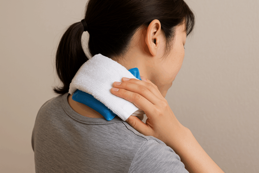 炎症が起きている可能性がある急性期は、まず冷却が基本となります。保冷剤や氷嚢をタオルで包み、首の痛む部分に15分〜20分ほど当てます。その後は30〜40分休み、再び冷やすサイクルを数回繰り返すと良いとされています。ただし、長時間連続で冷やすと皮膚を傷めるリスクがあるため注意が必要です。