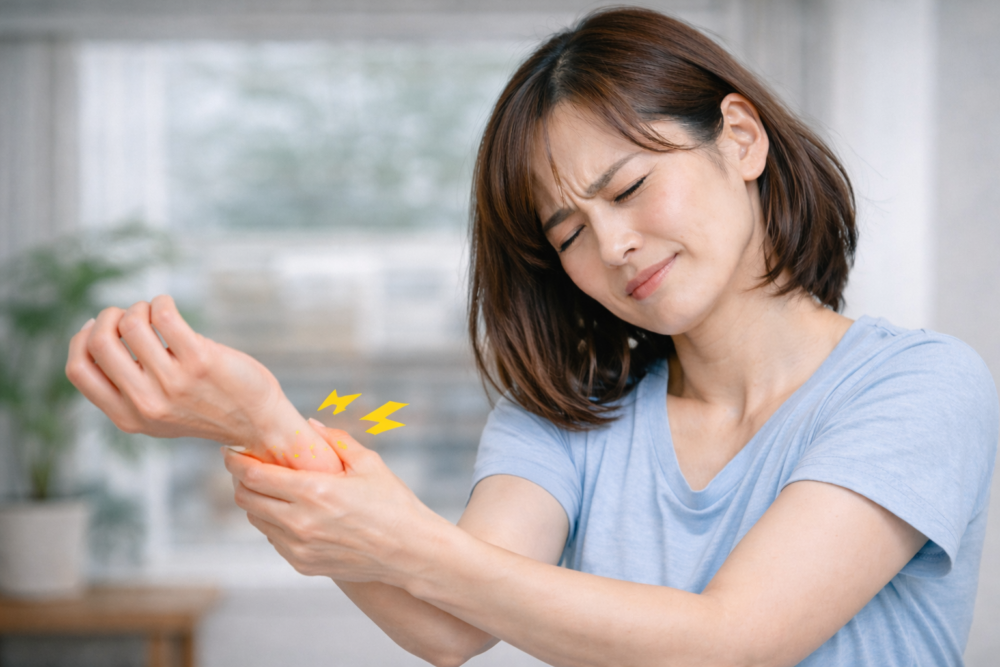 神経性は、腕や指のしびれ、力の入りにくさが目立ちやすいタイプ。血管性は、腕の冷えや色の変化、むくみのような感覚が出ることがあるそうです。